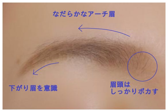 眉尻は、下がり眉になるようにして。眉頭の位置よりも低めになるようにすると、優しい印象になります。眉頭はスクリューブラシでしっかりとボカして、ナチュラル感を出しましょう。