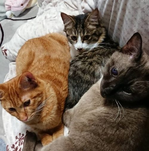 家族の一員となったツナくんはすぐにタクトくんと打ち解け、先住猫とも仲良しに。3匹で猫団子を作ることもありました。