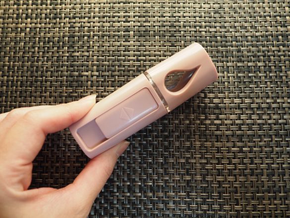 このように電源をONにするとすぐに勢いよく噴射が始まります。 水を入れるだけでどこでもうる肌に もっと寂し気な感じの噴射量でなかなか潤わないのでは……、と思っていましたがそんなことはなく、シューッという音とともにミストをしっかりと肌に感じられました。  顔はもちろん、身体の乾燥が気になるところにも使用可(15~20cm程度離してあてる)だそうなので、髪にも。  上部には鏡がついているので、フェイススチーマーとしてだけではなくメイクを確認したり、直したりするときにも役立ってくれます。(※使用時はフタを閉めるので、鏡を見ながら使えるわけではありません) 上部には鏡がついている 小型なのでメイクポーチにも入っちゃいます。パッと見加湿器と分からないくらいパッと見加湿器と分からないくらい馴染んでます