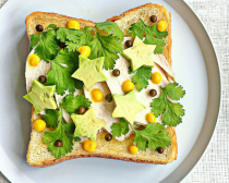 3 星形に抜いたアボカド(星形でなくてもいい)、パクチーをバランスよくのせ、塩水漬けこしょうを散らし、マスタードをしぼる。