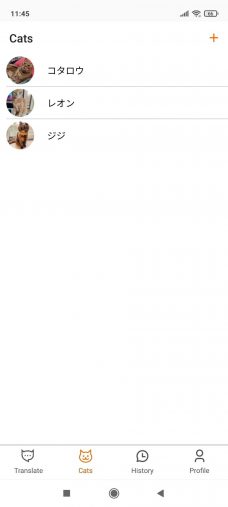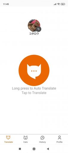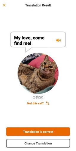 愛猫の登録が完了したら、鳴き声を検知したい子をセレクト。オレンジのボタンを押し、猫の鳴き声を聞かせると、翻訳された言葉が出てきます。