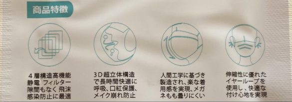 KF94マスク(10枚入り)は、Amazonで購入すると税込2000円でした。1枚200円となかなか高価です。KF94マスクの特徴は下記のとおり。