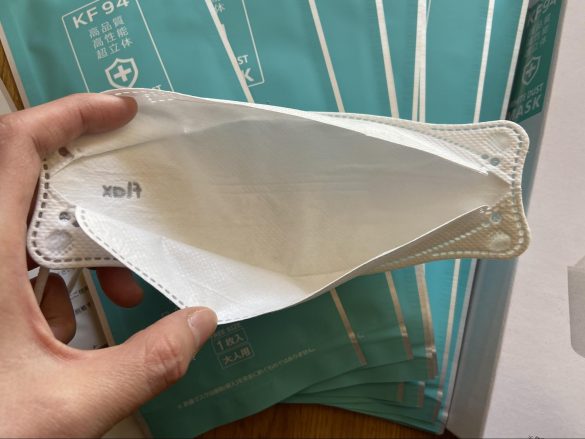 通常の不織布マスクは、立体感を出すため蛇腹折りになっていることが多いですよね。KF94マスクは前面がツルンとしています。
