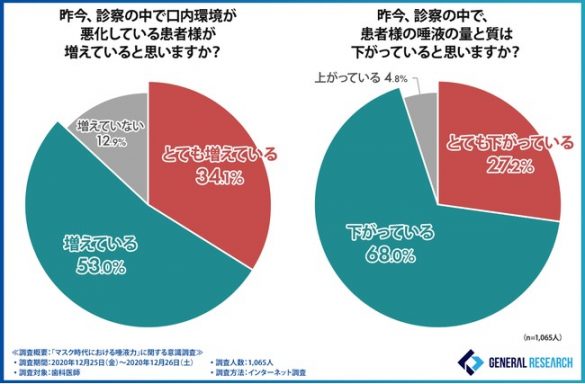 ゼネラルリサーチ株式会社が歯科医師1,065人を対象におこなった「マスク時代における唾液力」に関する調査(※1)では、「昨今、口内環境が悪化している患者が増えていると思いますか?」との問いに、8割以上の歯科医師が「増えている」と回答。さらに、「昨今、患者の唾液の量と質は下がっていると思いますか?」という質問には、9割以上が「下がっている」と回答しています。