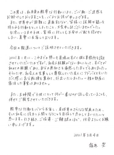不倫疑惑について真偽のほどはわかりませんが、今福原さんの胸中はいかに……? そこで、直筆の謝罪文と以前の福原さんの筆跡から、現在の心理について、筆跡心理学に基づいて分析してみました。