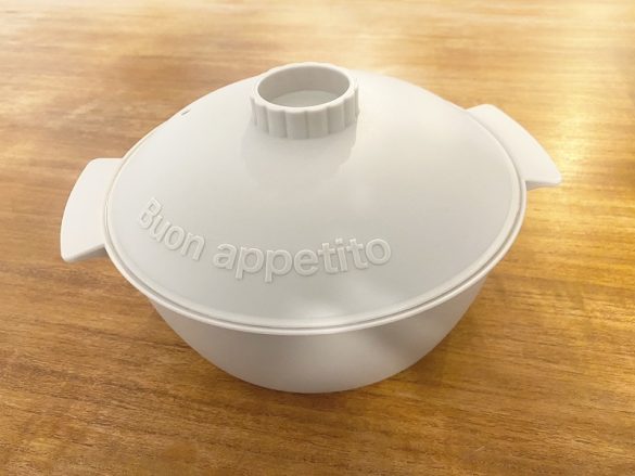 噂のビストロヌードルは品薄で、何店舗か回ってようやく入手できました。ポリプロピレンでできた1人用サイズの鍋で、耐熱温度が140℃、耐冷温度は-20℃。ころんとしたデザインとライトベージュのカラーがとてもかわいいです。もちろん330円(税込)で購入することができます。