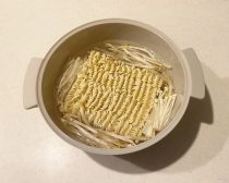 野菜を入れる場合は刻んで麺の下に入れるように書いてありました。要は水にきちんと浸かっていれば問題ないのだろうと、筆者は麺の上には置かないよう気を付けつつ隙間に入れ込みました。