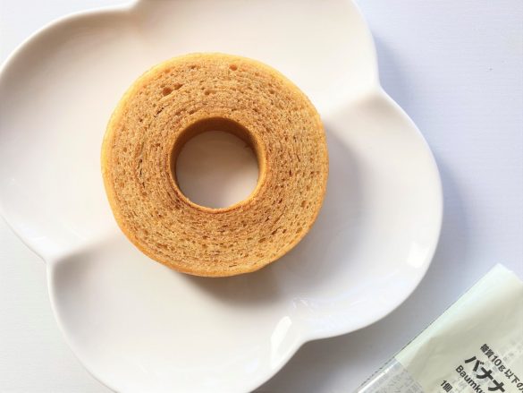 直径約7.5cmと手のひらサイズほどの大きさです。袋を開けるとふわっとバナナの香りが漂いました。低糖質のお菓子は味気ないイメージがありましたが、無印良品のバナナバウムはしっかり甘さがあり糖質が抑えられているとは思えないクオリティ。
