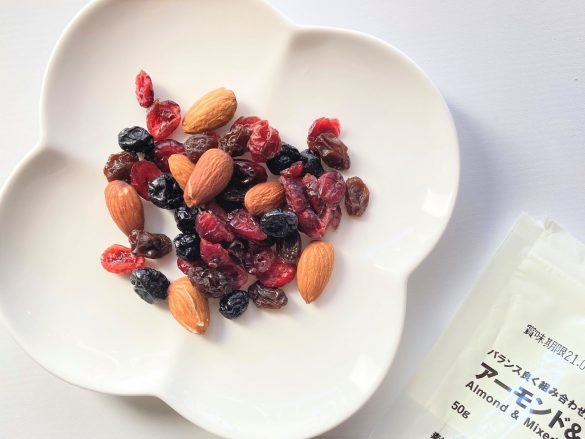 無印良品にあるミックスナッツのなかでも特におすすめなのは、アーモンドとドライフルーツがバランスよくミックスされた「アーモンド&ベリー」(250円/税込)です。素焼きアーモンドなので、塩分が気になる方でも食べられます。