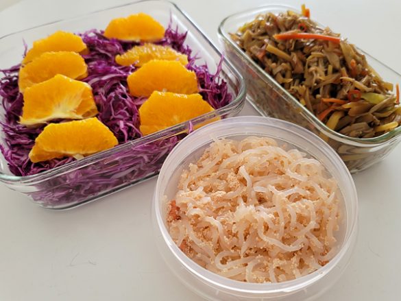 私のお気に入りは、ポリフェノールが豊富な紫キャベツのマリネ、きんぴら炒め、たらこと白滝の炒め和え。
