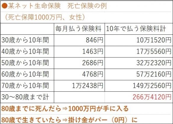 30歳の女性の場合。1000万円の死亡保険は、先に書いた毎月846円だったりします。ただし、これは契約年数が10年です。846円ですから、1年で1万152円、10年で払う総額は10万1520円です。例えば、22歳のときに産んだ8歳の子どもがいて、この子どもが18歳になるまでの補償がほしいということであれば、10年後に契約の期限が来た時に終わり。払ったお金は掛け捨てですから戻ってきません。