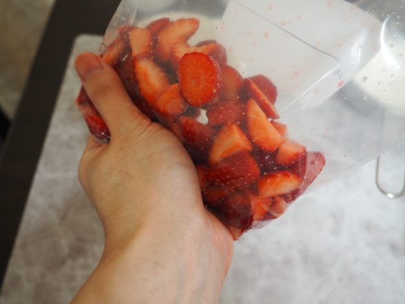 (2)いちごは適当な大きさにカットし、袋に入れて手で揉むもしくはミキサーで攪拌
