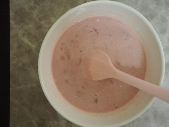 (4)粗熱が取れたら潰したいちご、ホイップクリームを加えてよく混ぜる