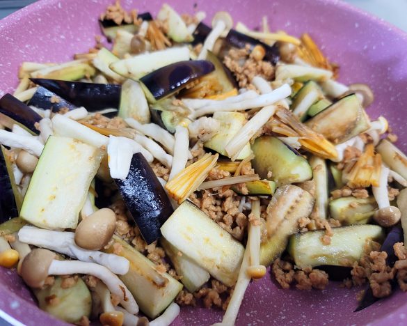メニューによって、大豆肉の形状が異なる。麻婆茄子はミンチタイプ、回鍋肉はフィレタイプが入っている
