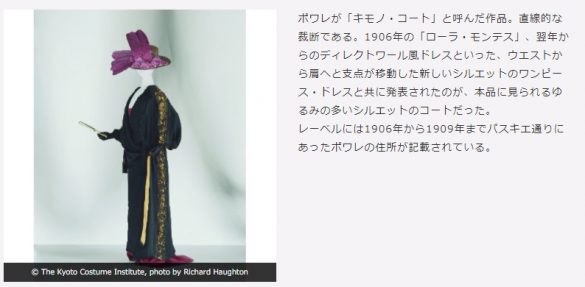 日本の着物もデザインソースとして繰り返し取り入れられるものの一つです。その発端は1906年、フランスのクチュリエであるポール・ポワレが「キモノ・コート」を発表し、直線的な裁断とゆるやかなシルエットでコルセットを放棄。西洋の服飾史に革新をもたらしたと言われています。