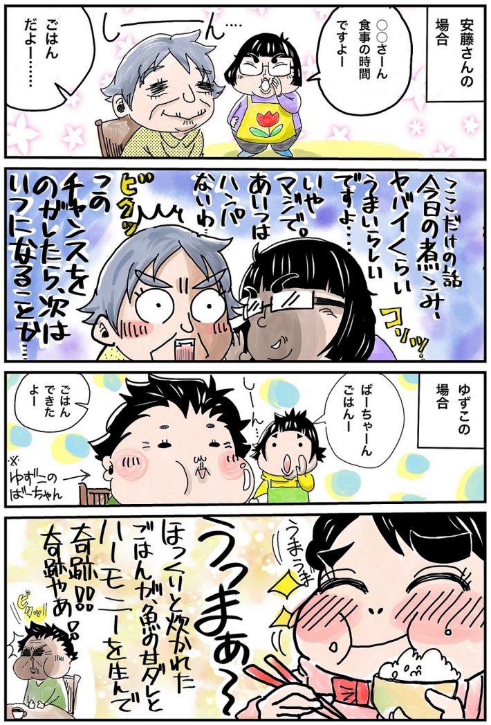 ゆずこ: へえ~。私はあれです。都内で雑誌記者をしていたんですが、当時は極貧で茨城のじーちゃんばーちゃんちに駆け込んだんです。都内まで電車で1時間だし、家賃かからないし。2人とも認知症だっていうのは知っていたけど、まあなんとかなるでしょ! って感じで。……で、さっそく次の日の朝からばーちゃんが暴走してボヤ騒ぎ。