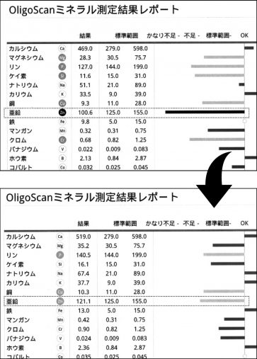 僕が今もっとも注目している検査手法に「オリゴスキャン」というものがあります。これは体内の必須ミネラル20種と有害重金属14元素を瞬時に測定できるというもの。検査は簡単で手のひらの4か所をスキャンするだけ。その場で解析結果が表示されます。