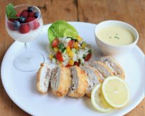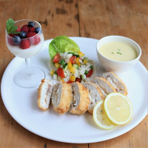 今回はマリコさんのひと皿の中から、特に身近な素材で簡単なレシピを紹介してもらいました。それは「チキン・コルドン・ブルーでひと皿」。ワンプレートに前菜のライスサラダとコーンスープ、チキン・コルドン・ブルーとデザートのヨーグルトゼリーの組み合わせです。