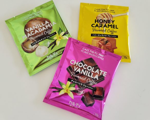 フレーバーは、チョコバニラ、バニラマカダミア、ハニーキャラメルの3種で、発売当初は100gパック(583円)でしたが、1杯分ドリップタイプ(130円)が登場してからは手軽に購入できるようになりました。