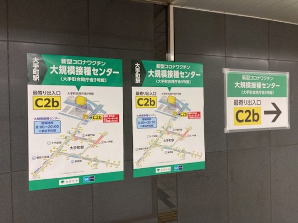 東京の大規模接種センターの会場は、大手町の合同庁舎。地下鉄大手町駅で降りると、いたるところに大規模接種センターへの道順が書かれたポスターが貼られているので、迷子の心配はありません。いざ、受付の白いテントへ。