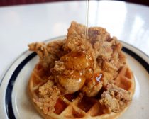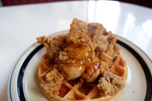 ワッフルチキンとは、焼きたてのワッフルに揚げたてのチキンをのせ、そこにメープルシロップをかけて食べるもの。日本人にはあまりなじみがないかもしれませんが、アメリカ人にとってはソウルフードのひとつになっているそうです。 それを食べることができるのが、東京・渋谷にあるハウスメイドダイナー「MOJA in the HOUSE」。からあげにワッフル、そしてメープルシロップと、一見異色の組み合わせですが、これがとにかく美味しい。私がお店を訪れたときも、店内は20~30代の女性客でいっぱい。その多くがこのワッフルチキンを食べていました。 名物の「ワッフルチキン」(税込1,430円)は、直径がおよそ15~16cmほどの、大きめのワッフルに、揚げたてのジャンボからあげが3個、ドドンとのっかっています。からあげはマリネしたチキンをスパイスでしっかりと味付けしており、そのまま食べても、もちろんOK。スパイシーな味付けのからあげです。ここにかけていくのがカナダ産の「ピュア・メープルシロップ」。ボトルのままテーブルに運ばれてきます。からあげの上で円を描くようにボトルを3回まわすのが適量とのことですが、好みの量をかけていただきましょう。シロップの甘さとからあげのスパイスの味が見事に調和!