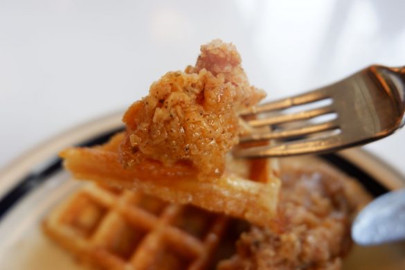 ワッフルはカリッとした食感に焼き上がっています。シロップをかければしっとりとしたポピュラーなワッフルの味に。それをナイフとフォークでカットして、そこにからあげをのせて一緒に食べてみると、ワッフルのフワしっとり感と、からあげのカリしっとり感が絶妙に合う! ワッフルでくるむようにして食べてみれば、ちょっと甘めのチキンカツバーガーのような味わいにもなります。