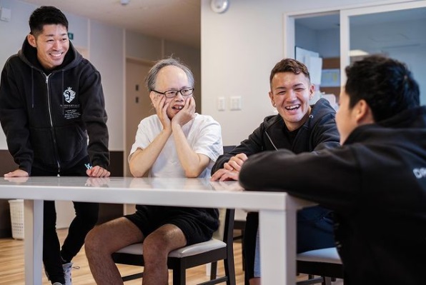 利用者さんとおしゃべりを楽しむマッチョ介護士たち