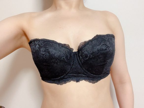 普通のブラジャーよりも安定感が高く、しっかりデコルテに押し上げてくれるタイプなのでストラップ付きでも通常の3/4カップに劣らないくらい優秀です。