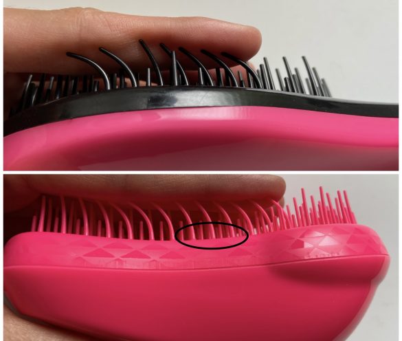 タングルティーザーは、ブラシ根本が硬く、先端が柔らかい細めの作りになっています。一方、ダイソーは、太めで全体的にフニャッと柔らかい……!