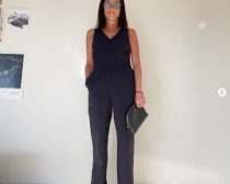 亘つぐみさん(以下、亘)「ちょっと前までは茶色やベージュを好んでいたんですが、最近、黒が好きなんですよね。このジャンプスーツはモデルでヨガインストラクターの野沢和香さんがディレクションする〈HEREIAM(ヘレイアム)〉のものです」