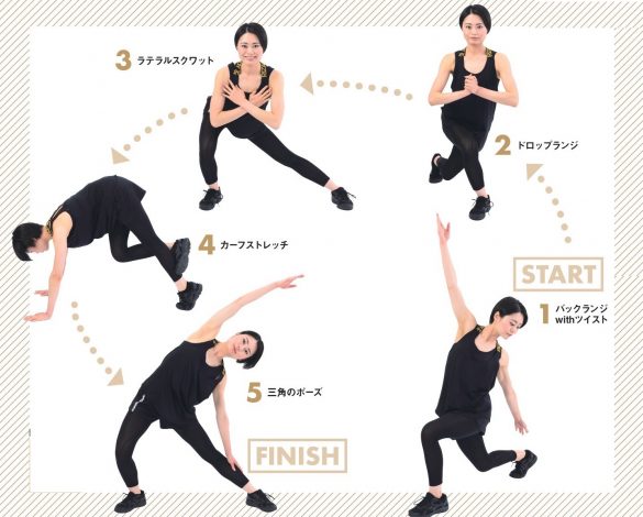 ストレッチ編は、わりと負荷の軽い5つのストレッチ系運動から構成されます。5つとは、1)バックランジwithツイスト、2)ドロップランジ、3)ラテラルスクワット、4)カーフストレッチ、5)三角のポーズ。