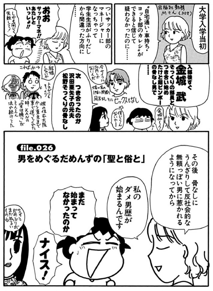 あの「だめんず・うぉ~か~」が帰ってきた!2000~2013年に週刊SPA!で連載され、大ヒットした漫画の名作選をお届けします。あらゆるダメ男=だめんずと、男を見る目がない女=だめんず・うぉ~か~の攻防は、令和のいまも変わりません。  自らもだめんず・うぉ~か~の作者・倉田真由美さん、ヨーコ会長、そして「だめんず」会員の女性たちのエピソードに、泣き笑いしてください。 (現在では微妙な表現も、当時のまま掲載します) だめんず07_1