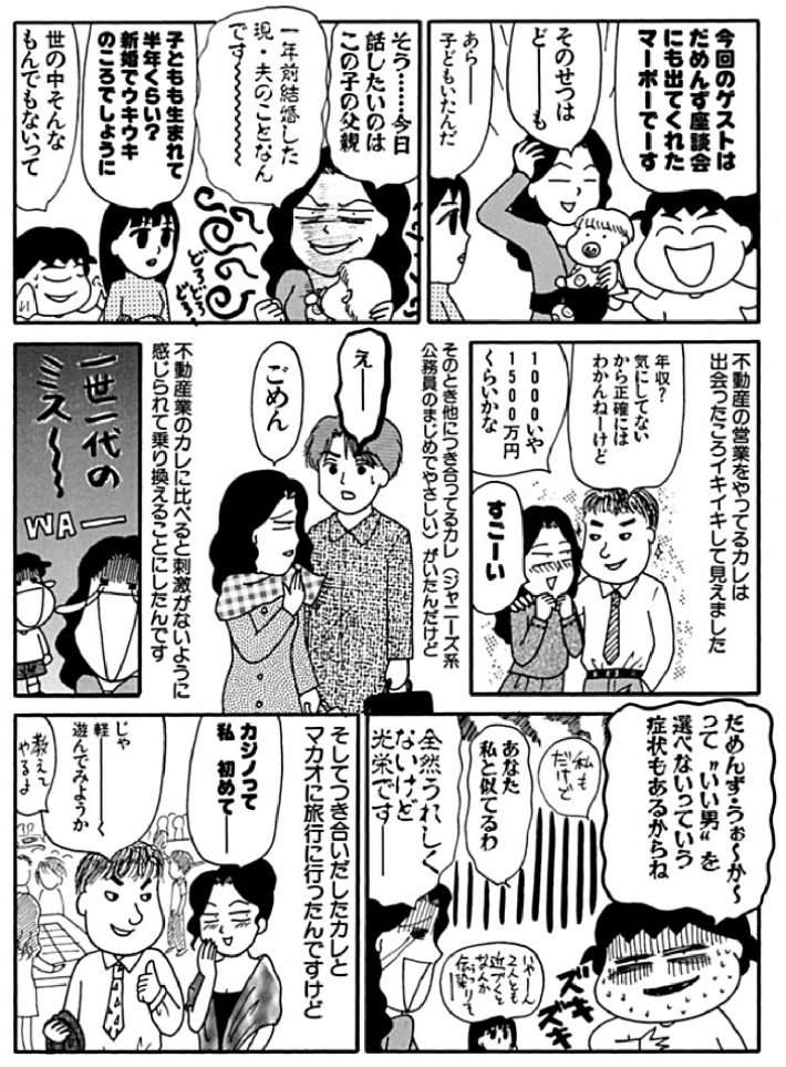 あの「だめんず・うぉ~か~」が帰ってきた!2000~2013年に週刊SPA!で連載され、大ヒットした漫画の名作選をお届けします。あらゆるダメ男=だめんずと、男を見る目がない女=だめんず・うぉ~か~の攻防は、令和のいまも変わりません。  自らもだめんず・うぉ~か~の作者・倉田真由美さん、ヨーコ会長、そして「だめんず」会員の女性たちのエピソードに、泣き笑いしてください。 (現在では微妙な表現も、当時のまま掲載します) だめんず12_1