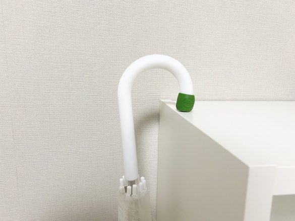 傘の持ち手にキャップを付けると目印になってくれて、傘立てを使用する時にも一発で自分の傘を見分けることができます。メリットはそれだけでなく、このように机の縁に引っ掛けた時に滑って傘が落ちてしまうことがないため、飲食店などでも便利!