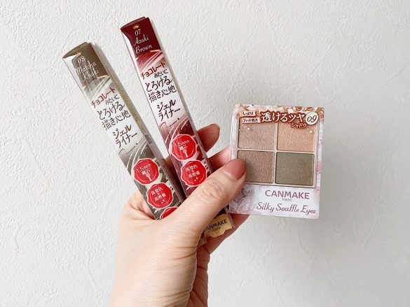 今回使用したのはキャンメイクから8月31日(火)に発売された「シルキースフレアイズ」の09 アーバンカーキ(限定)と「クリーミータッチライナー」の08 マッチャカーキ(限定)、07 アズキブラウン(新色)です。