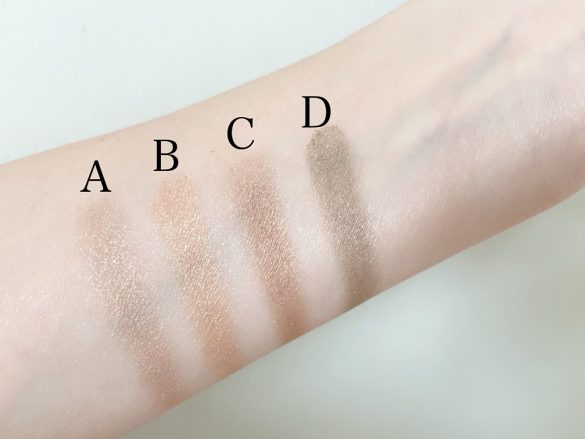 スウォッチしてみたところ、A・B・Cはベージュ~ブラウン、Dはミルキーなカーキなので、カーキが苦手な人でもチャレンジしやすそうです。