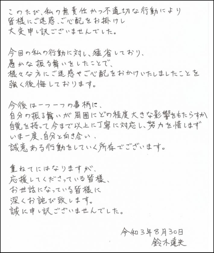 鈴木さんはその後活動を休止し、先日直筆の謝罪文を発表。さっそくこの筆跡から、現在の心境や鈴木さんの性格について、筆跡心理学で分析してみました。
