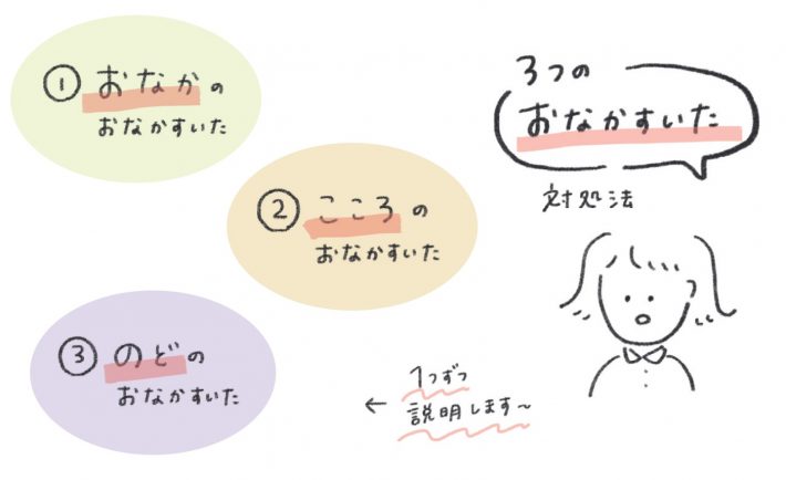 3つの「おなかすいた」対処法を1つずつ説明します。