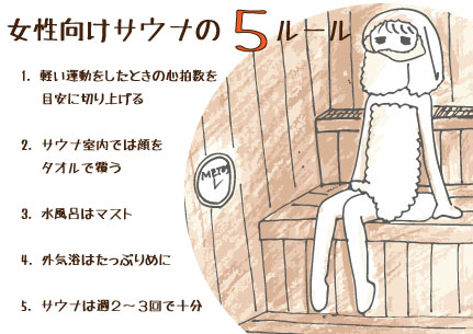 サウナは、サウナ→水風呂→外気浴を繰り返すことで心身ともに整った状態になります。よく耳にするサウナ用語の「ととのう」ですね。その快感がやみつきになり、「ととのう」ことを目指して自分を追い込むサウナ―は少なくありません。    しかし、加藤先生によると、女性の場合は決して激しく追い込んではいけないのだとか。 「追い込みすぎると逆に自律神経が乱れ、月経不順などのトラブルの原因になります。体に負担をかけないよう、体調に気を付けながら入り、しんどさを感じたらすぐに中断するのが鉄則です」  そこで、具体的に挙げてもらった「女性向けのサウナの5ルール」をひとつずつ見ていきましょう。