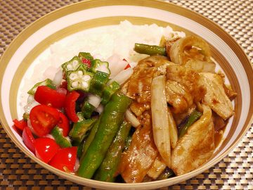 豚バラ肉200g、玉ねぎ1/2個、ししとう8本(ピーマン2個でも可)、しょうがみじん切り1片分、カレールウ2皿分、お湯200ml、鰹粉大さじ1、油大さじ2、酒大さじ1、塩コショウ適宜、ごはん適量、オクラ(塩ゆで)2本、ミニトマト4個、玉ねぎみじん切り少々、レモン汁、塩