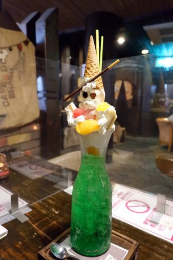容器は、高さは27.6cmほどもあるワイン用のデキャンタ。そこに氷とメロンソーダが入れられており、その上にはアイスクリームやフルーツなどが盛り付けられています。これで990円という値段設定にも驚きます。