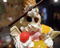 てっぺんにはトンガリ帽子のコーンを斜めにかぶった、かわいらしいお顔。これはバニラアイスとレーズンで作られています。なんとなく、雪だるまを思い出してしまいますね。その下には生クリームのラッフル(ひだひだのエリ)が。さらにその周囲をさくらんぼ、ミカン、ピーチ、バナナ、パイナップルが固めています。両サイドのバナナがバンザイをしているようで、これまたかわいい。