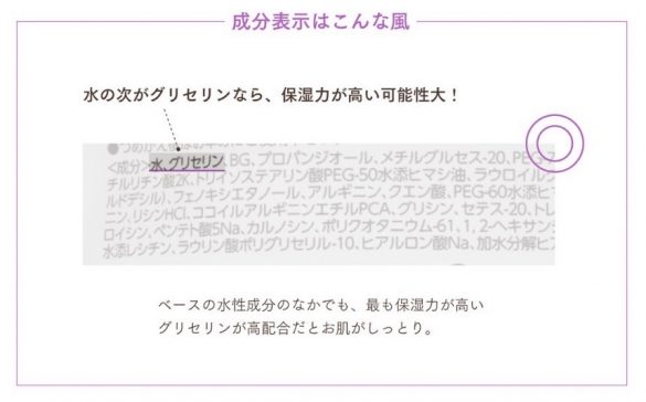 化粧水の役割は、私達世代だと保湿ですよね。本書によると、「水性成分の中で最も保湿力が高いのが、グリセリン」。次いで「BGは低刺激、DPGはサラッとした使用感が魅力的な保湿剤」。乾燥が気になる人はグリセリンがイチ押し、逆に油っぽさが気になる人はエタノール成分配合の化粧水を候補に挙げるのが良さそう。