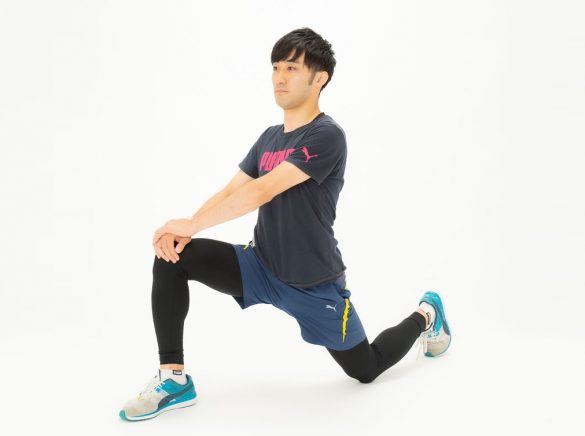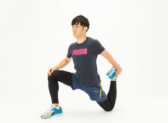 曲げている膝側の脚の前もも(大腿四頭筋)がしっかり伸びているのを感じられたらOKです。