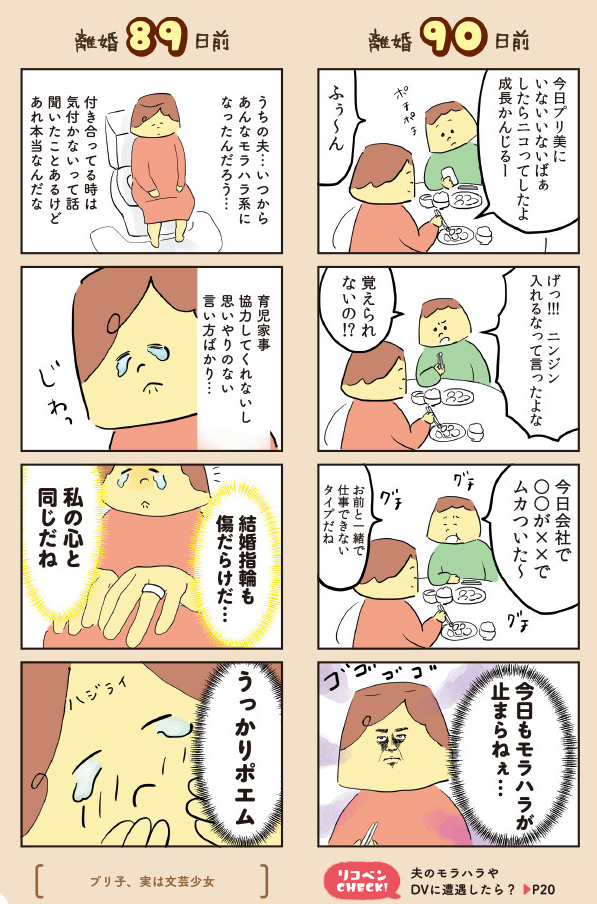 新生児を抱えた専業主婦プリ子が、夫プリ彦からモラハラ・DV・不倫のフルコースを食らい、離婚するまでの100日カウントダウンを描いたコミックエッセイ『離婚まで100日のプリン』。