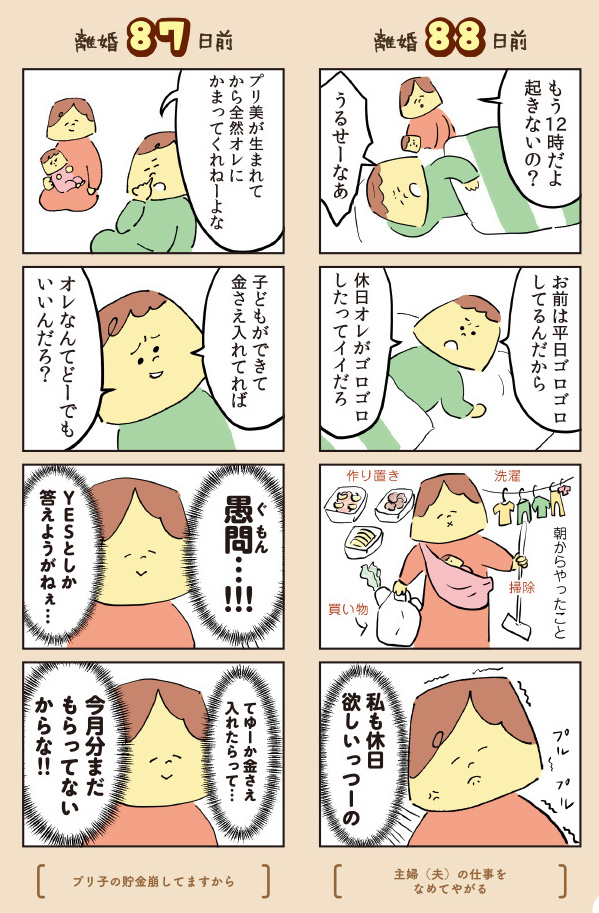 夫からモラハラ・DV・不倫のフルコースを食らい、離婚するまでの100日カウントダウンを描いたコミックエッセイ『離婚まで100日のプリン』。