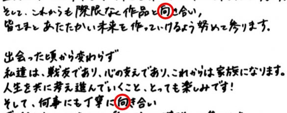 そこで、「字が似ている!」と話題になった、先日直筆で結婚を発表した菅田将暉さんと小松菜奈さんの筆跡を例に、筆跡が似ているカップルについて相性の良い字のポイントと悪い字のポイントをご紹介します(署名から文章の筆跡を見て、前半部分が菅田さん、後半部分が小松さんとして分析しています)。