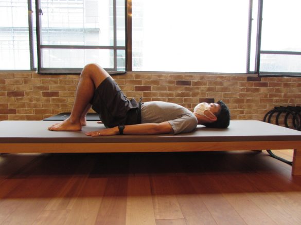3. 口から息を吐きながら、お腹に力を入れ、恥骨が高くなるように骨盤を傾ける。その後、足を踏み込み、背骨を下の方から順にひとつずつ床から持ち上げていく