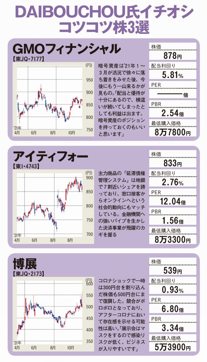 同氏の目下の注目銘柄はGMOフィナンシャル。主要事業のGMクリック証券が、暗号資産やFXやCFDといった金融取引商品で好調。11月1日に発表された第3四半期決算では18%の増収で22%の増益だった。
