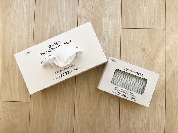 カインズ「使い捨てマイクロファイバークロス 20枚入り」398円、「カウンタークロス 20cm×30cm 20枚入」198円